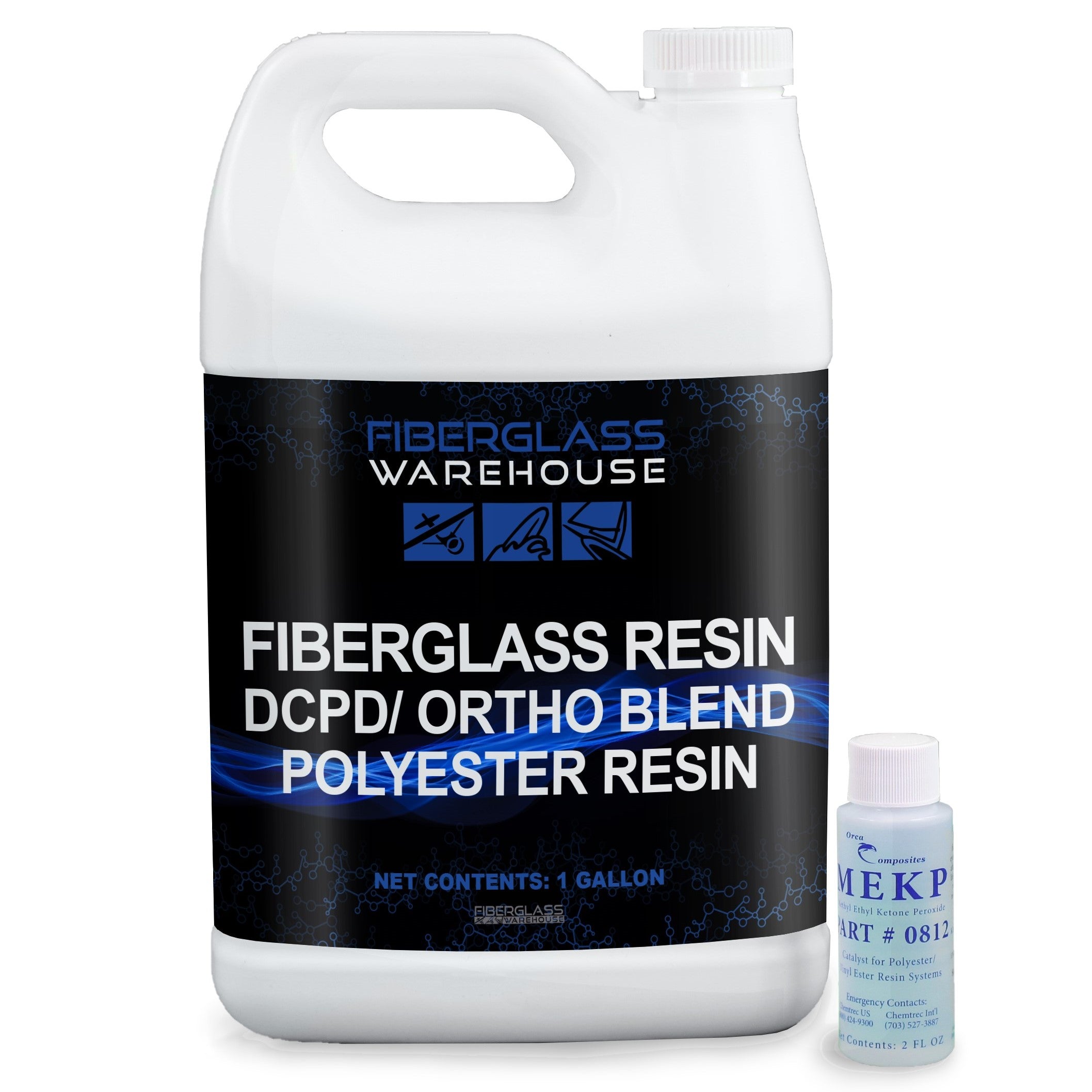 Fiberglass Warehouse Fiberglass Resin is a DCPD/Ortho blend that is easy to use and cures tack-free. It is compatible with fiberglass cloth, chopped strand mat and knit fabrics as well as carbon fiber. It has a fast wet out and dries quickly to a hard finish. Fiberglass DCPD/Ortho resin comes with MEKP catalyst which is required for resin to cure.